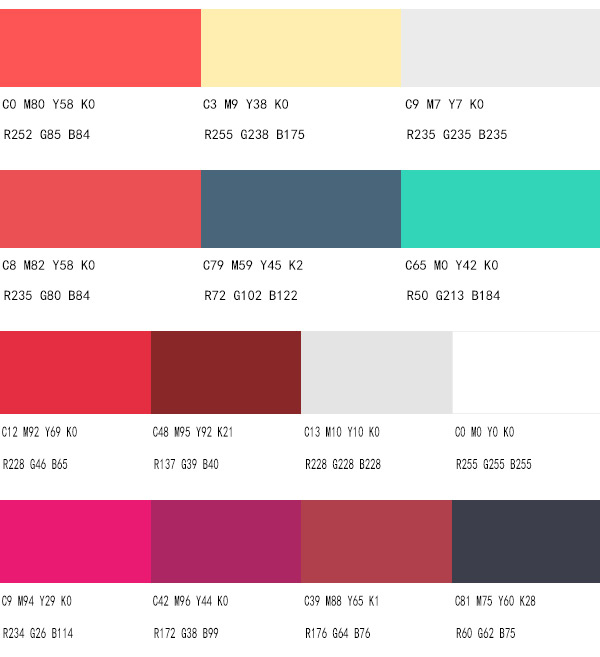 选择红色配色的主色时,可将其他较亮的粉红色作为配色。在搭配红色时,你可以选择一些较亮的冷色或暖色。红色最好使用相同的色系。要注意颜色的纯度不要太高,高纯度的色调不要太多,暖色和冷色的差别不要太大。