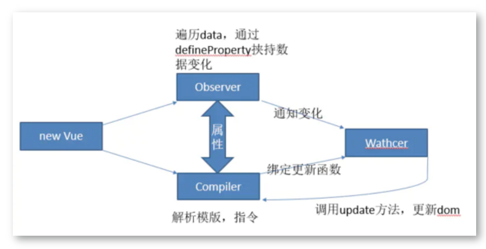 当我们 new Vue 的时候,会调用Observer ,通过 Object.defineProperty 遍历 vue 对象的 data、computed 或者 props(如果是组件的话)的所有属性进行监听。同时通过Compiler 解析模板指令,解析到属性后就 new 一个Watcher 并绑定更新函数到 watcher 当中,Observer 和 Compiler 就通过属性来进行关联。
