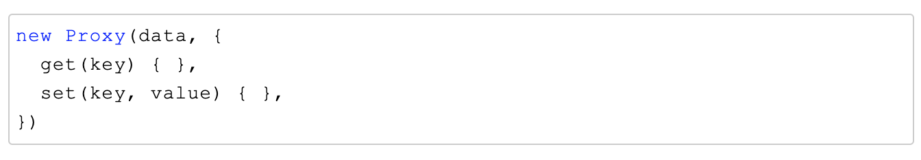 可以看到,proxy 不需要关心具体的 key,它去拦截的是 修改 d ata 上的任意 key 和 读取 data 上的任意 key。