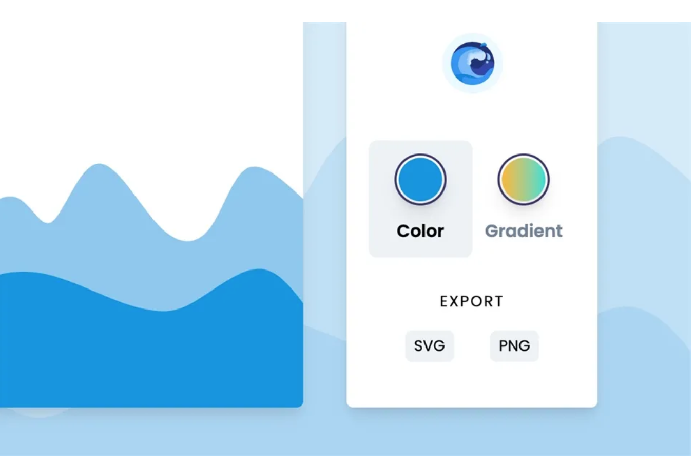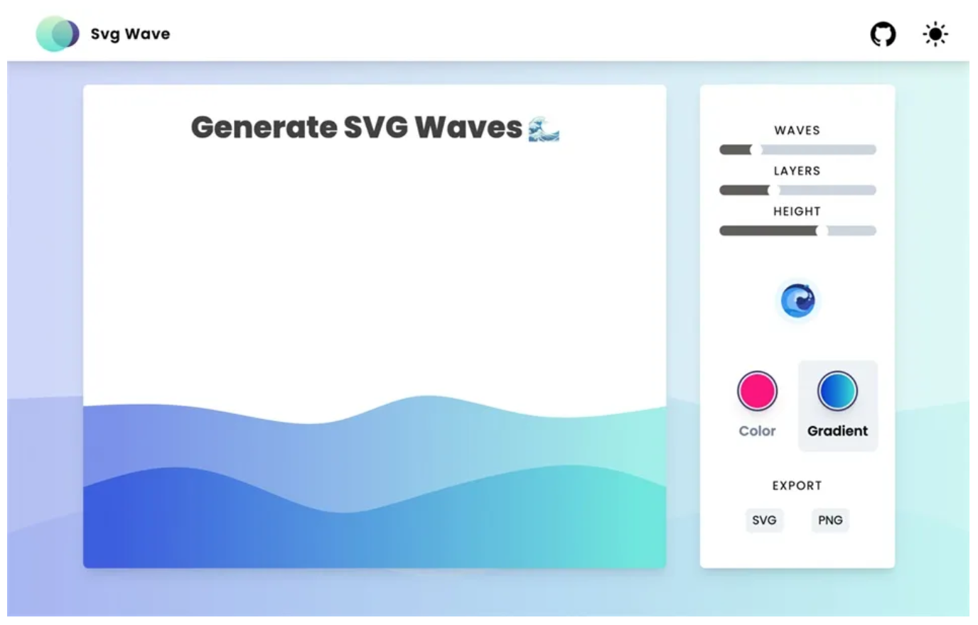 如果你不确定怎么做比较好看,随机按钮点一下就会立即产生某个样式,在 Svg Wave 能将波浪图输出为 SVG 或 PNG 格式(SVG 直接给出源码),若你觉得开发网页时使用单色背景看起来太过单调,Svg Wave 是个不错的选择。