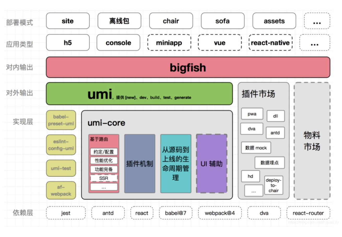 脚手架主要是为前端团队做工程化管控的工具, 使用它我们可以轻松的开发应用和打包部署, 目前也有很多脚手架生态百花齐放, 其核心还是对 nodejs 和 webpack 等的掌握, 就拿umi来说, 作为企业开发的开箱即用的集成工具已经是非常强大了, 我们可以定制umi的插件, 利用其加载机制去实现各种复杂业务的场景应用. 如下: