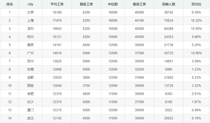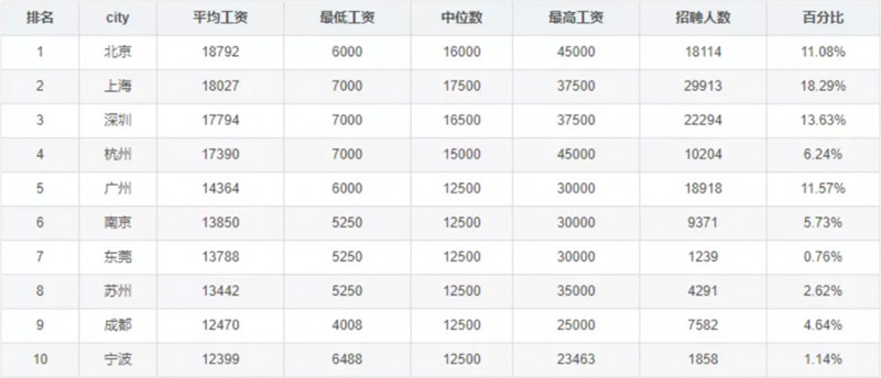 4月工资待遇名列前茅的城市依然是一线城市北京、上海、深圳。