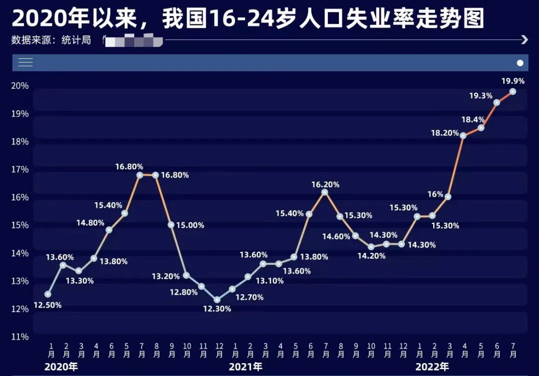 前段时间,国家统计局发了最新的经济数据,从去年12月后,我国16-24岁人口失业率已经7连涨,青年失业率继续上升,冲到19.9%,史无前例,大概意思就是每5个年轻人,就有一个面临失业。