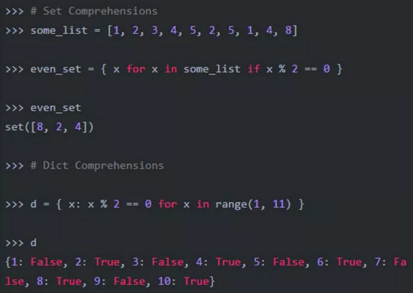 在第一个例子里,我们以some_list为基础,创建了一个具有不重复元素的集合,而且集合里只包含偶数。而在字典表的例子里,我们创建了一个key是不重复的1到1之间的整数,value是布尔型,用来指示key是否是偶数。这里另外一个值得注意的事情是集合的字面量表示法。我们可以简单的用这种方法创建一个集合: