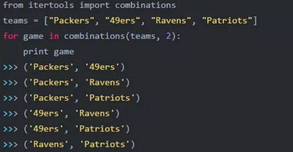 和collections库一样,还有一个库叫itertools,对某些问题真能高效地解决。其中一个用例是查找所有组合,他能告诉你在一个组中元素的所有不能的组合方式
