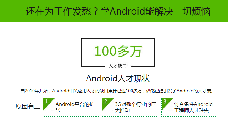 大量的用户需求,使得Android硬件和软件的开发仍在源源不断的迭代更新,同时也造就了大量的专业技术人才缺口。据业内统计,目前国内Android人才总缺口有100多万,主要分为硬件驱动和软件应用两个方向,其中后者人才需求高达72%,包括手机游戏、手机终端应用软件和其他手机应用软件的开发等。